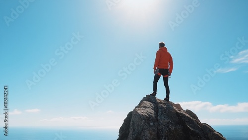 Adventurer standing on a rock, overlooking a vast ocean under blue sky.