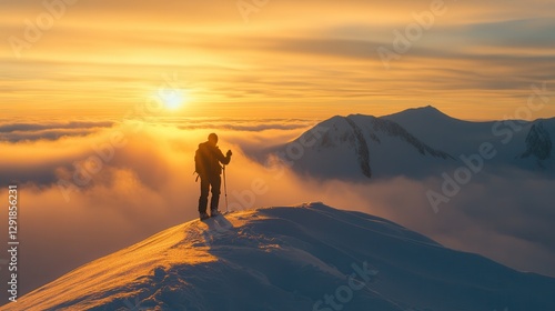 Adventurer stands on snowy peak at sunrise overlooking misty valleys and mountains