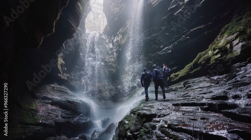 Adventurers in a Stunning Cave with a Waterfall and Light Beams Striking Down