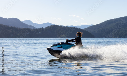 Adventurous Caucasian Woman on Sea-Doo riding in the Ocean. Lighthouse park in background. West Vancouver, British Columbia, Canada.