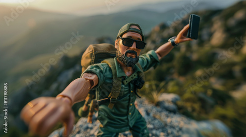 Adventurous hiker capturing a selfie at sunset on a scenic mountain trail.