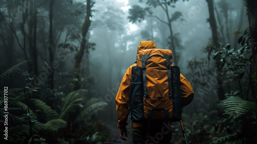 Adventurous Hiker Exploring Misty Forest in Rainy Weather