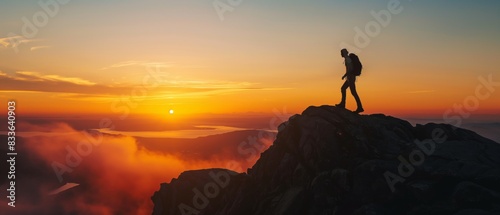 Adventurous Hiker Standing on a Mountain Peak at Sunrise, Beauty of Nature, Spirit of Exploration