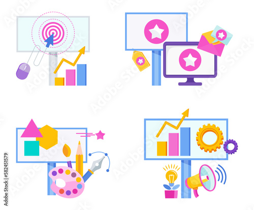 Advertising and promotion icons set. Promotion strategy. Digital Marketing.