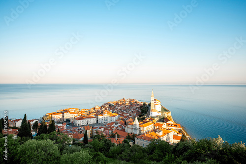 Aerial city scape view on Piran town with church tower and Adriatic sea in Slovenia. General plan with copy space