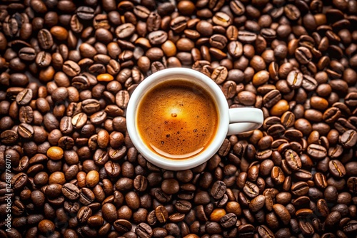 Aerial Close-Up: Espresso Shot with Coffee Beans on White Background