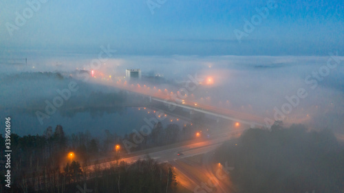 Aerial dawn colored view over heavy fog clad urban scenery of the Pärnu river and town with bridge, streetlamps and distant buildings