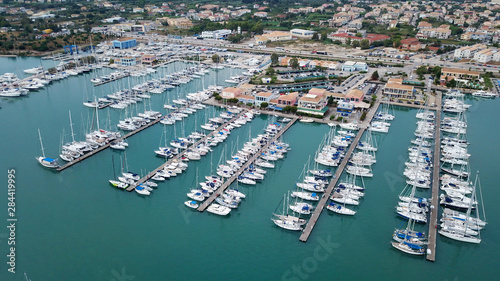 Aerial drone bird's eye view photo from popular Marina full of yachts and sail boats in Lefkada city waterfront, Ionian, Greece