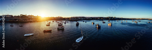 Aerial drone panoramic view of sunset at Cascais Bay, in the Lisbon region of the Portuguese Riveira