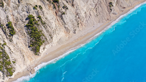 Aerial drone photo of famous paradise beach of Egremni white steep rocky hills overlooking deep turquoise Ionian sea, Lefkada island