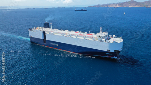 Aerial drone photo of huge car carrier ship RO-RO (Roll on Roll off) cruising in Mediterranean deep blue Aegean sea