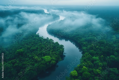 aerial drone photography of pristine amazon rainforest river winding through lush green canopy in morning mist, environmental conservation