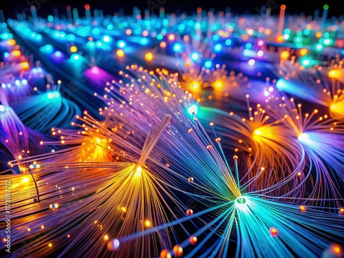 Aerial Drone Shot: Fiber Optic Network, Illuminated Nodes, Abstract Technology Background