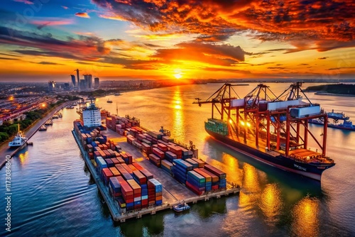 Aerial Drone Shot: Sunset Seaport, Busy Docks, Cargo Ships, Maritime Trade