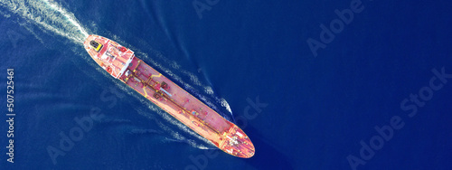 Aerial drone ultra wide photo of latest technology in safety standards crude oil tanker cruising Saronic Gulf deep blue sea, Greece