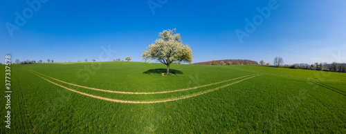 Aerial drone view, landscape with blooming apple trees in Johlin