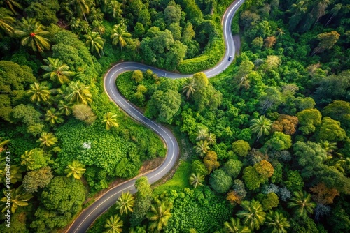 Aerial Drone View of a Jungle Road Amidst Lush Greenery and Scenic Landscape for Fashion Photography Inspiration