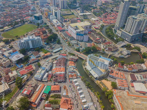 Aerial drone view of big and dense Malacca City with Malaysian settlements at Melaka, Malaysia.