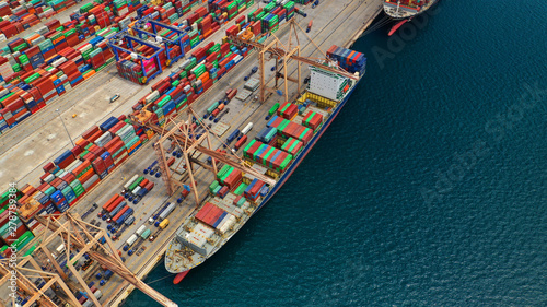 Aerial drone view of industrial cargo shipment and logistics port terminal with container trucks, ships and cranes