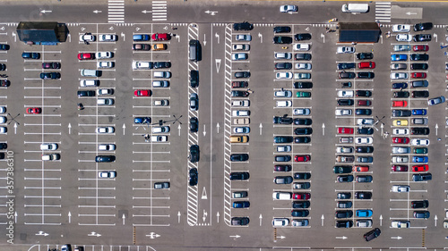 Aerial drone view of parking lot with many cars from above, city transportation and urban concept