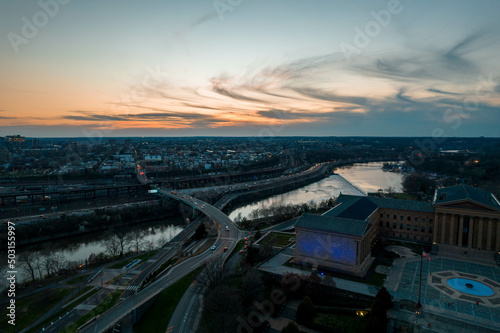 Aerial Drone View of Philadelphia Skyline at Dusk