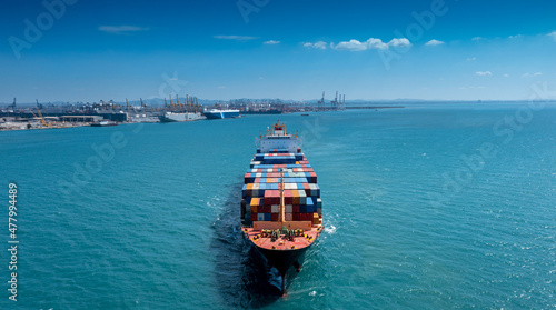 Aerial in front of cargo ship carrying container and running for export goods from cargo yard port to custom ocean concept freight shipping by ship .
