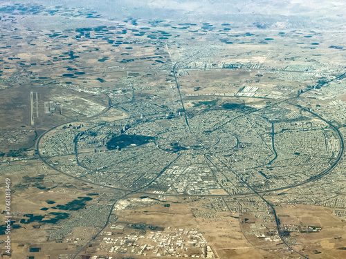 aerial landscape view of Erbil (Hawler) one of the oldest continuously inhabited cities in the world, located in Kurdistan Region in Iraq with surrounding desert landscape and Erbil INTL Airport