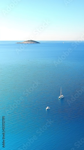 Aerial of boats sailing the vast turquoise sea near a distant island on a clear, sunny day