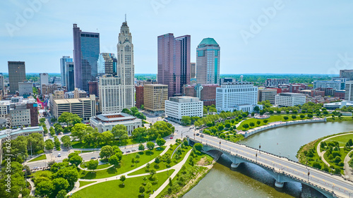 Aerial over Columbus Ohio river and bridge leading to downtown
