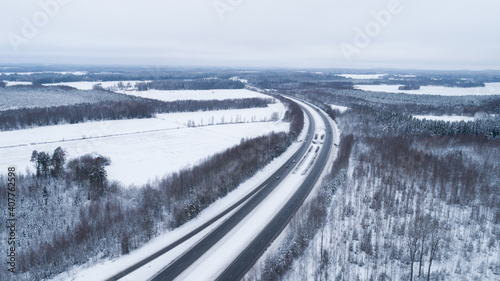 Aerial Panoramic Drone View of a beautiful Snow Covered Valley and a Scenic Road in Finland. Cloudy winter day.