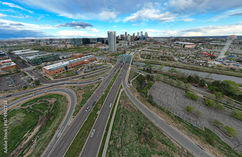 Aerial panoramic view of downtown Denver, Colorado, USA with modern skyscrapers, residential buildings, and green spaces along the river at sunset. Vibrant urban skyline and cityscape architecture.