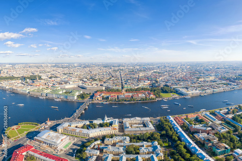 Aerial panoramic view of Neva river in Saint Petersburg, Russia with many landmarks