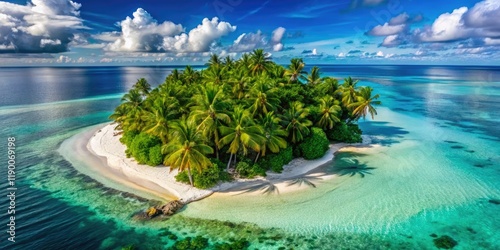 Aerial paradise: lush palm trees, pristine beach meet vibrant ocean in stunning drone shot.