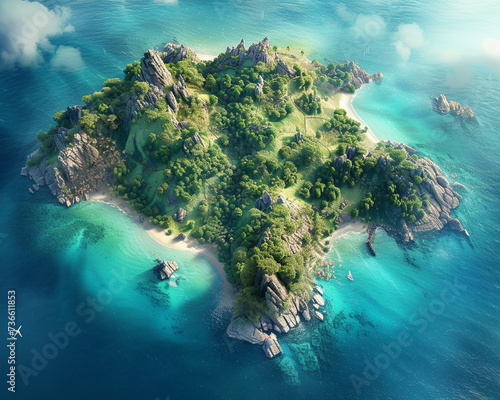 Aerial perspective of a secluded island its shores kissed by the sea presented in a realistic and spectacular panorama