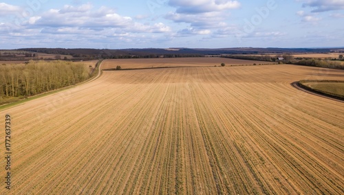 Aerial perspective of an agricultural field post-harvest, emphasizing seasonal change