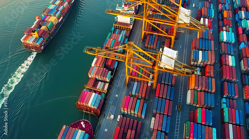 Aerial perspective of colorful containers and cargo ships at a port, global logistics