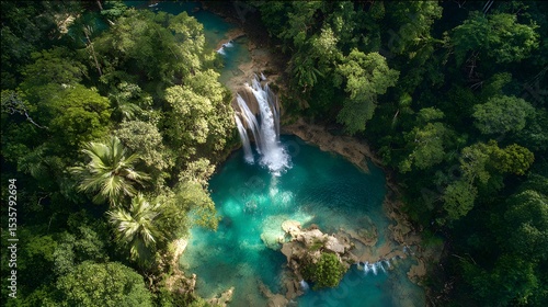 aerial perspective showcasing a majestic cascading waterfall plunging into a vibrant turquoise pool, embraced by dense tropical greenery and untouched rainforest beauty.