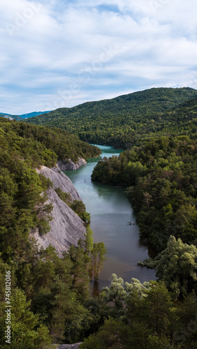 Aerial photo by drone of the Chanteloube bridge drowned in the turquoise waters of the Serre-Ponçon lake, located in the Hautes-Alpes, in France