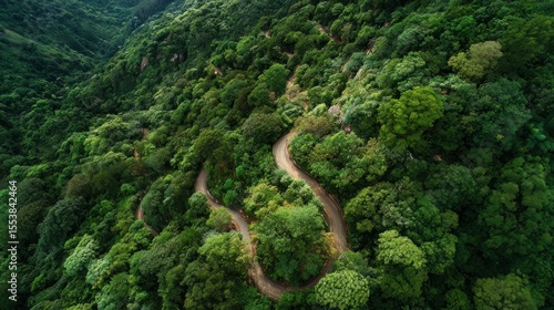 Aerial photograph of winding path in lush mountain forest on sunny day