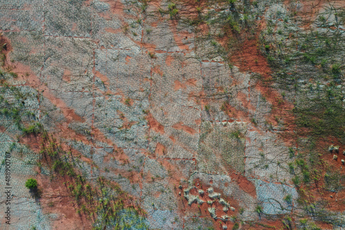 Aerial photography background texture of abandoned soil and weeds at construction site