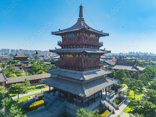 Aerial photography of Huayan Temple in Datong, Shanxi, China on a sunny summer day with fiery clouds