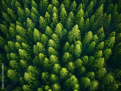 Aerial shot capturing the lush green canopy of a dense forest, showcasing nature's beauty and the vitality of evergreen trees.