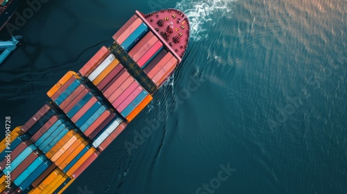 Aerial shot of a large cargo ship loaded with colorful containers cutting through the deep blue ocean, symbolizing global trade and transport.