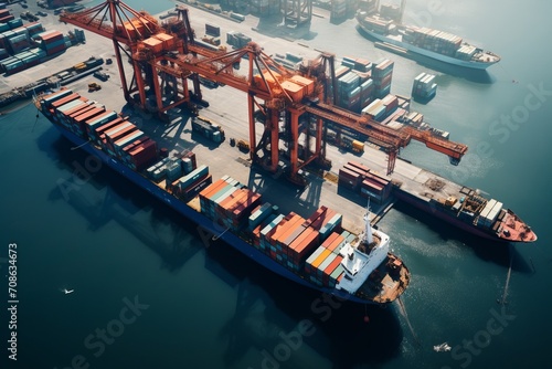 Aerial shot of cargo ships at the industrial port with containers stacked.