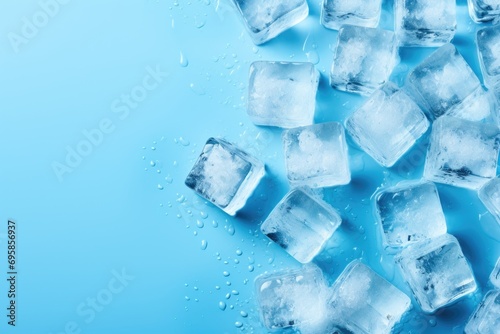 Aerial shot of cubes, ice, and drips isolated on a blue background. Generative AI