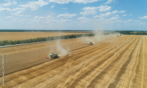 Aerial shot of harvester combine machines are in process of harvesting ripe wheat on the golden field.