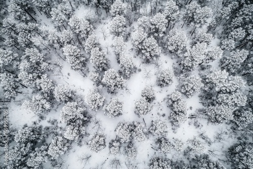 Aerial Snowy Woods, Trees Covered in Snow, TopDown View, Winter Landscape, Outdoor