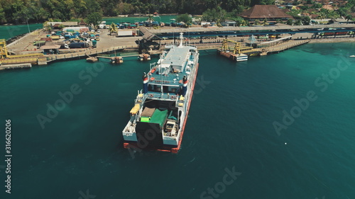 Aerial Top Drone Flight over Big Ferry Boat Sailing to the Island Harbor in Tropical Nusa Penida, Bali Island, Indonesia. Blue Crystal Water. Travel Vacation Tourism