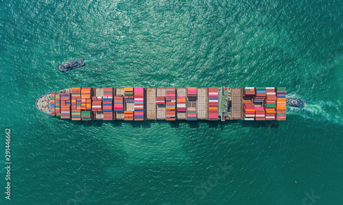 Aerial top view container ship carrier container on the green sea for logistics, import export, shipping or transportation.
