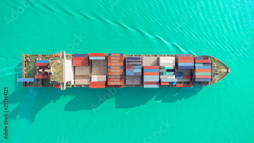 Aerial top view container ship on the sea for logistics, import export, shipping or transportation.